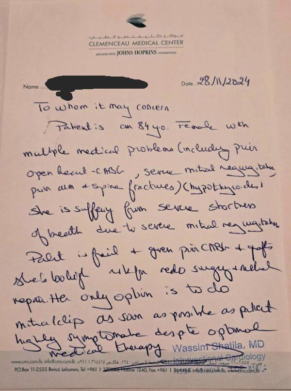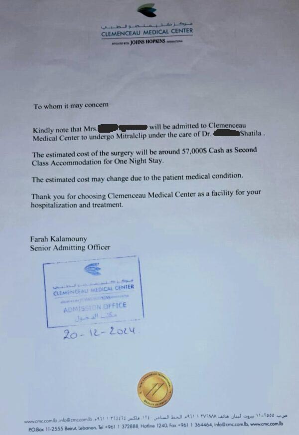 وفقًا لأطباء القلب، لا يُمكنها إجراء جراحة قلب مفتوح لإصلاح الصمام التاجي لأنها ستكون خطيرة جدًا . بعد العديد من الفحوصات والتصوير، سيكون الإجراء الوحيد المُتاح لإنقاذ حياتها هو مشبك الصمام التاجي…Mitral Clip… إنها عملية قلب من خلال الدخول عبر الشرايين وذلك لإصلاح الصمام التاجي والذي سيحل المشكلة و يُخفف كثيرا من أعراضها المُزمنة ويمنحها فرصة لحياة أفضل. تبلغ تكلفة هذه العملية 57,000 دولار أمريكي، وهو مبلغ يفوق قدرتنا المالية، وبخاصةً بعد معاناة لبناننا الحبيب.من كافة الازمات ….